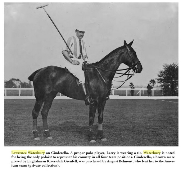 Larry Waterbury, as his friends called him, belonged to one of NY's oldest families and became a prominent sportsmen, including playing with LI's most prominent polo players.    After making a fortune as a stock broker in 1907, he became entangled in what was to become known as the Teapot Dome Scandal in the 1920s and lost much of it.