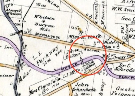Regarding the schoolhouse on Duryea Rd., it is not from 1872. That schoolhouse was located on the southeast corner of Duryea and Maxess Roads. The Motor Parkway purchased the Smith property from his heirs in April 1910. In June that year the Parkway sold one acre of land on the east side of the school to district 15 for $300. It was on this land a new schoolhouse was built and has survived to this day.