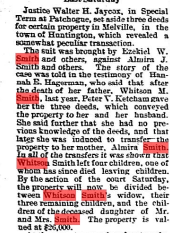 Sept., 1907 article from "The Suffolk County News" discussing a law suit brought by the Smith family heirs and how the property was to be divided.