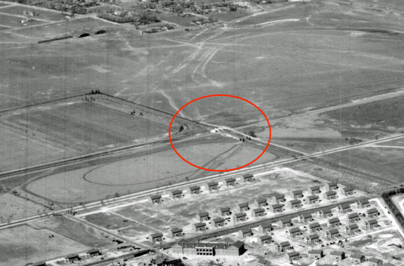 Further evidence is provided by the Main entrance on Stewart Avenue. Notice how the roadway runs south and comes within a few yards of the westernmost home on Ellington Ave. EAST. This road is NOT Selfridge Ave., and before creation of the Quad, extended as far south as the flight line.