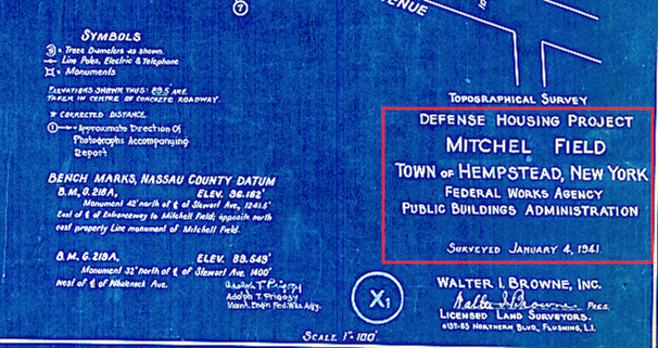 Mitchel Gardens was built in 1941 as a FHA project to house military personnel and was constructed between Stewart Avenue and the Motor Parkway. It was transferred to the War Dept. in 1947. (NCDPW)