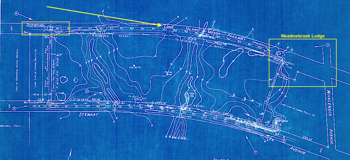 1941: The Roosevelt Field Motor Parkway Bridge and the Meadow Brook Club Bridge are shown on this topographical map as is the outline of the Meadowbrook Lodge off of Whaleneck (Merrick) Avenue. (NCDWP)