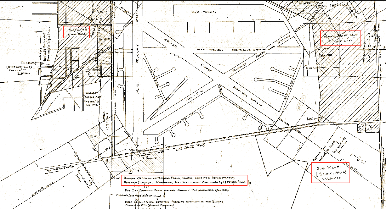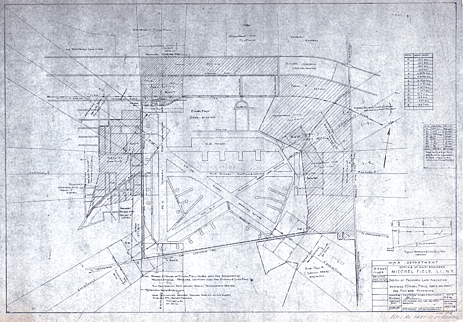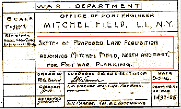 As these plans show the War Dept. required additional land beyond the original Mitchel Field "for Post War Planning" and as such proposed acquiring adjacent parcels in 1946.