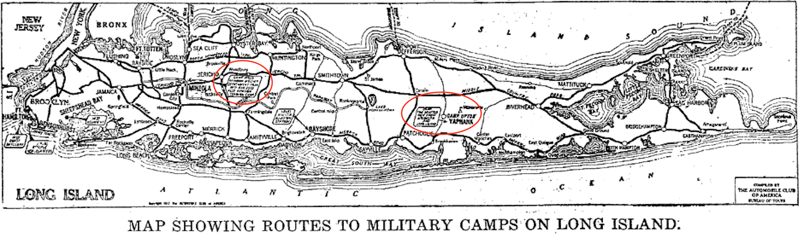 1917 map compiled by the The Automobile Club of America indicating routes to military camps on LI. From what I can make out I see Camp Mills and Camp Upton.