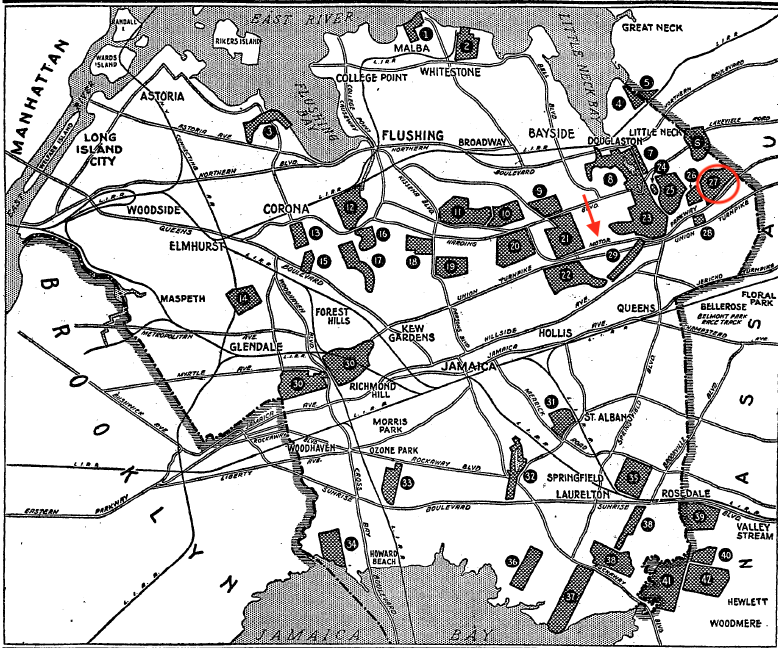 #20 (Fresh Meadows GC) became the site of Fresh Meadows after the War, which is where I grew up (on the other side of Horace Harding Blvd). #18 (former reformatory school) became the site of Queens College in 1937, from which I graduated (when there was no tuition). #19 (Pomonock GC) became Pomonock apartment complex. #23 became Alley Pond Park and surrounding garden apts and houses, with a right of way taken for the the Cross Island Parkway. #33 became the Aqueduct Race Track. #s 12 (the Ash dump) and 16, 17 became the site of the 39-40 and 64-65 World Fairs, which after 65 became Flushing Meadows Park, #3 became portions of the Grand Central Pkwy right of way and a part of what became LaGuardia, #30 (Forest Park) was used for the right of way for the Interboro Pkwy (now Jackie Robinson Pkwy), #13 - the southerly portion became LeFrak City (1959-60), #10, 11 became postwar housing in Fresh Meadows, north of Horace Harding, the site for Francis Lewis HS (from which I graduated), Kissena Golf Course (public) and Kissena Park [I could go on but I’m getting dizzy going back and forth between the map and these comments]