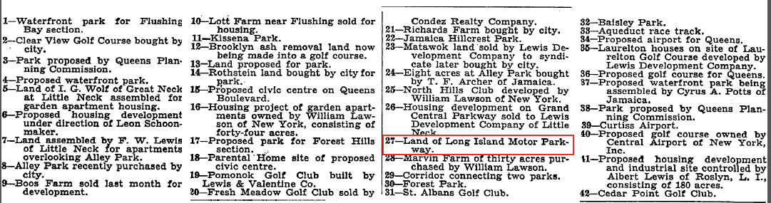 Interesting map from 1931 published in The New York Times showing land purchases, who purchased the land and intended purposes. Motor Parkway property noted as #27. The next picture provides details for each location.