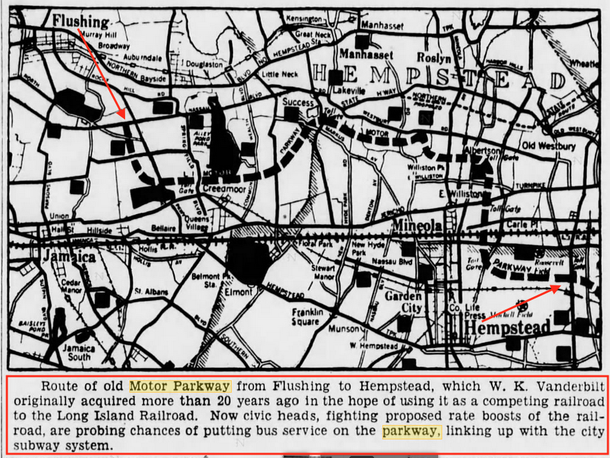 In 1935 LIRR commuters were upset with increasing fares (does anything ever change?) and looked at using the Motor Parkway as a bus route. This like the previous noted Hollywood, Queens never materialized. Opening sentence also misstates why Willie K. purchased the land for the Parkway. (Brooklyn Daily Eagle)