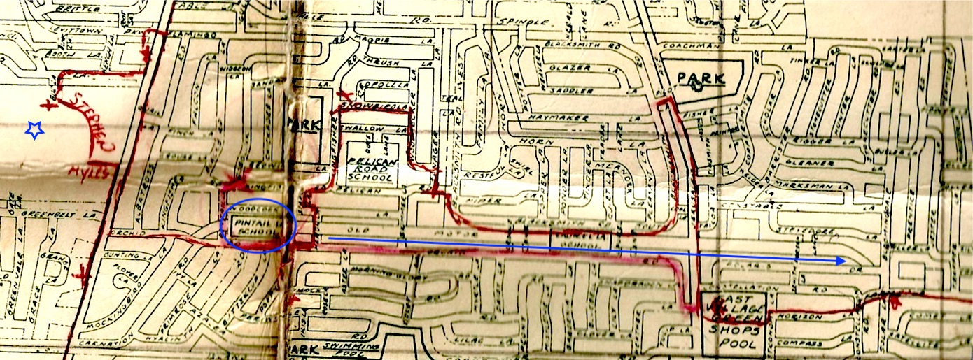 I purchased this Meenan Oil map with the red outlines already in place. Shows the Pintail Elementary School in Levittown which was featured in a recent msytery photo along with other schools on or nearby the Motor Parkway. The blue star is approximately my house built in 1954 so I'm dating this map to be circa 1951.