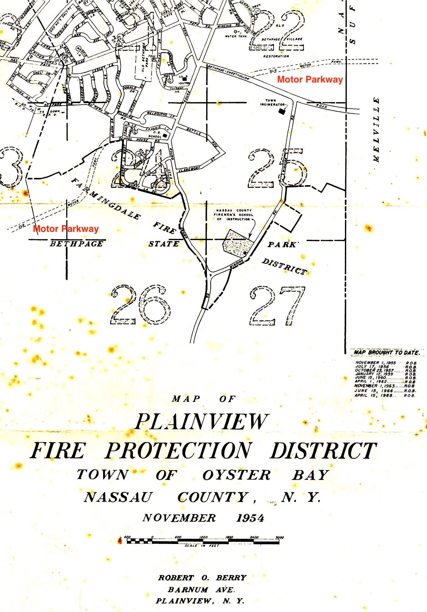 1954 Plainview FD map showing the Motor Parkway disappearing out of Bethpage State Park and reappearing on the southern border of Old Bethpage Village Restoration.
