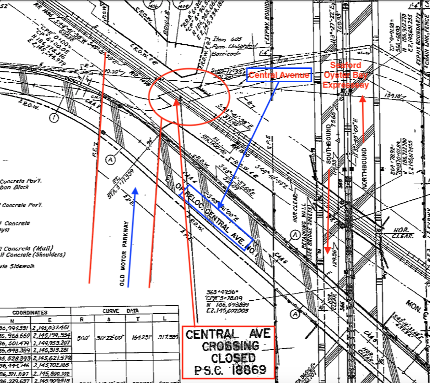 The 1961 plans for the construction of the Seaford-Oyster Bay Expressway show the relocation of Central Avenue south of the LIRR tracks. Courtesy of NYSDOT.