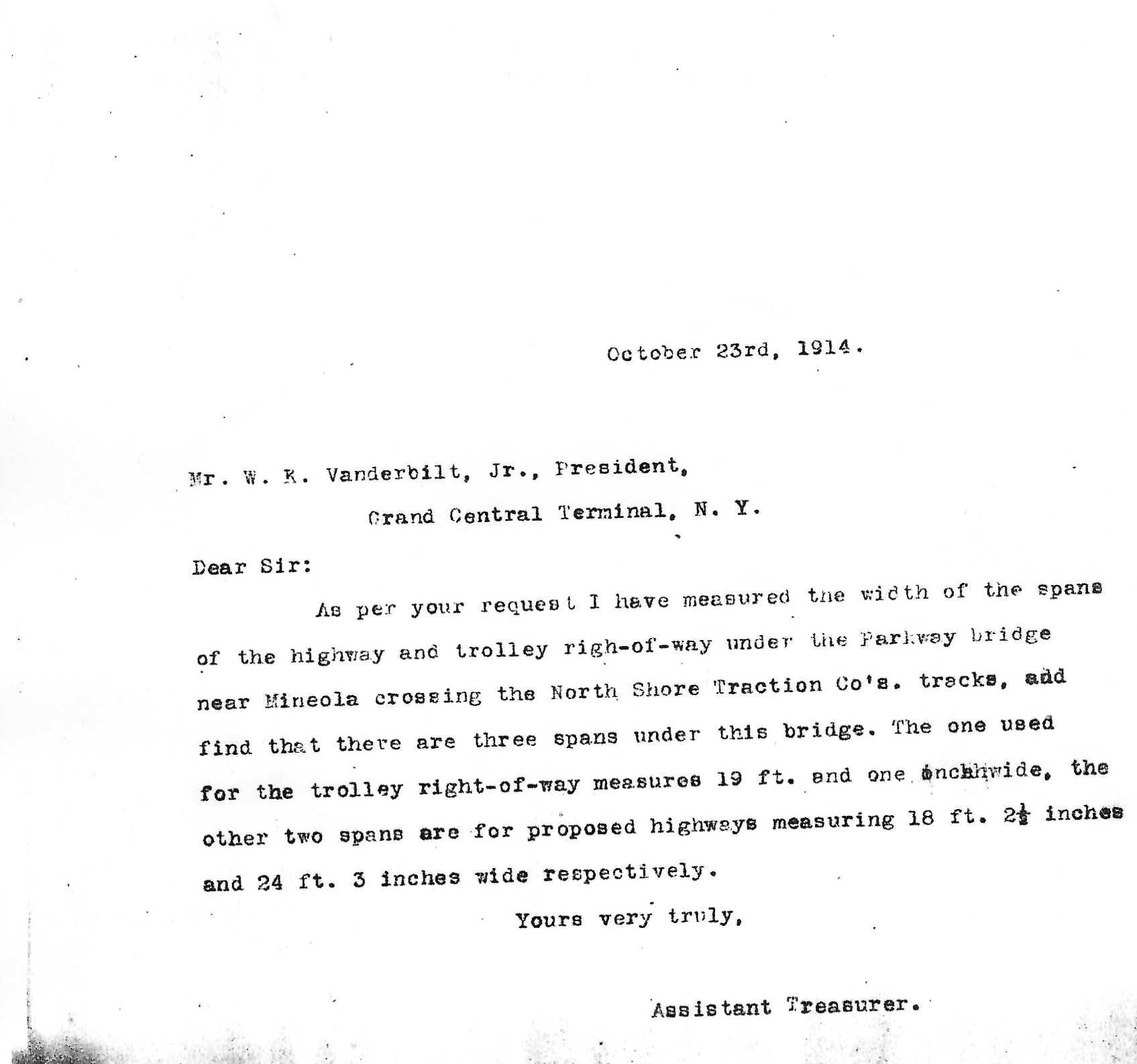 A 1914 letter from Alfred Kienzle (Assistant Treasurer) to William K. Vanderbilt Jr. in response to the latter's question pertaining to the width of the spans above the proposed highways and trolley right of way.