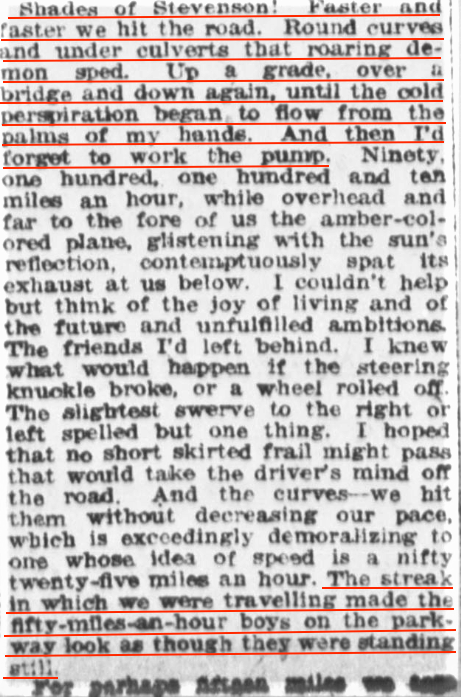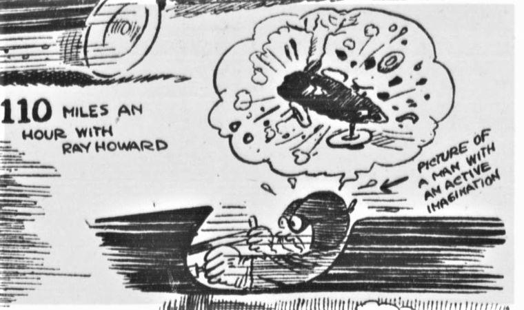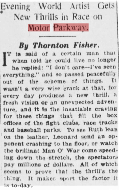 Sometime around 1920, newspaperman Thornton Fisher of The New York Evening World spent an exhilarating day in the air and on the ground racing on the Motor Parkway. Here is his illustrated account which appeared in the Evening World on March 23, 1921.