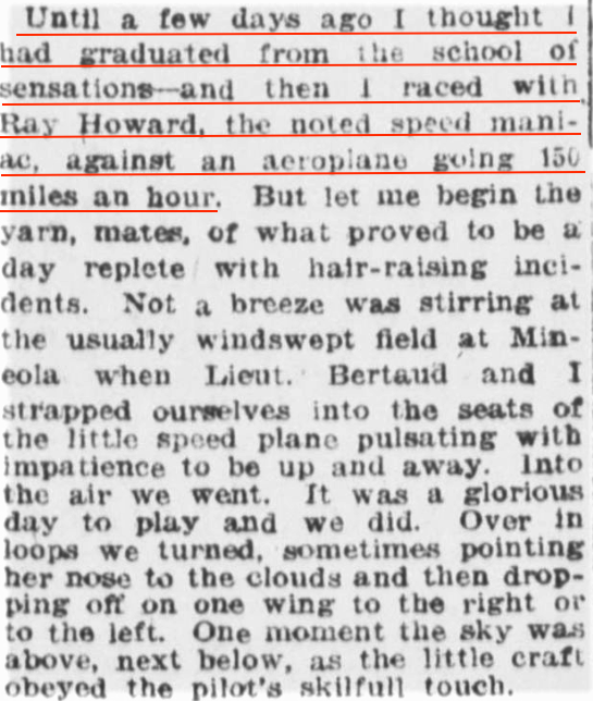 Never one to miss a story, he was invited by Lt. Lloyd Bertaud to fly above the Hempstead Plains and experience several aerial tricks.