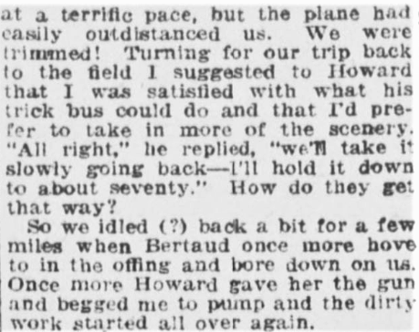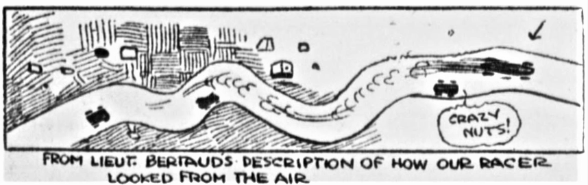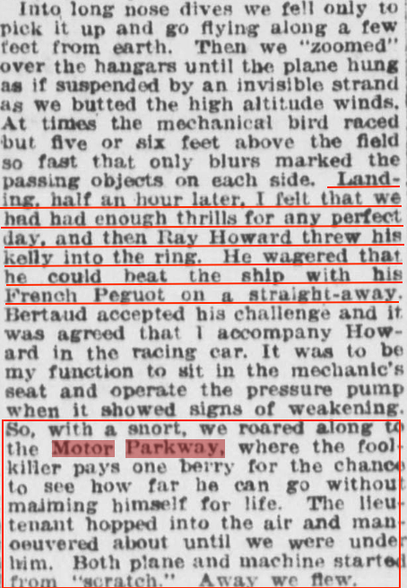 Upon landing, Bertaud was challenged by Ray Howard to race his plane against Howard's Peugeot racer along a stretch of the Motor Parkway.