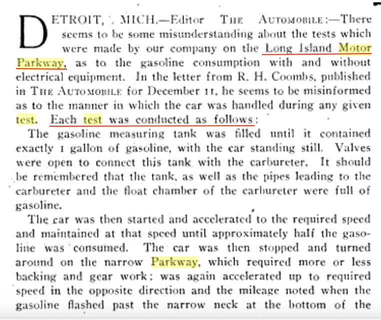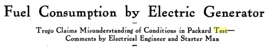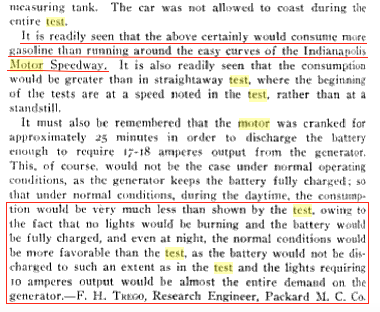 This test was conducted by the Packard Motor Car Company to determine the impact of electronic usage on fuel consumption. The article is in response to a letter to the editor and was written by an electrical engineer for Packard and a "starter man". (The Automobile, December 18, 1913)