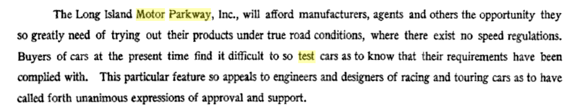The 1906 prospectus for the The Long Island Motor Parkway specifically mentioned product testing as a purpose. (The Long Island Motor Parkway, Kroplick/Velocci)