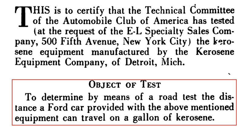 The purpose was to measure the distance a car would travel using a carburetor manufactured by the Kerosene Equipment Company of Detrioit.