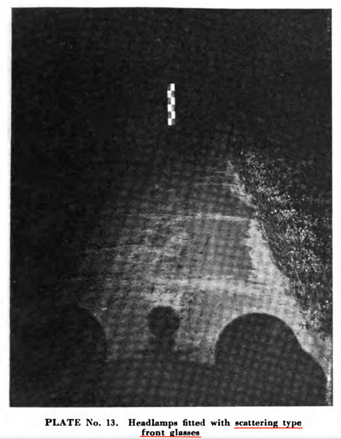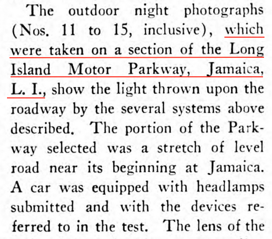 A car was fitted with various types of headlights and driven on the Motor Parkway during the evening; photographs were taken to compare light dispersion.