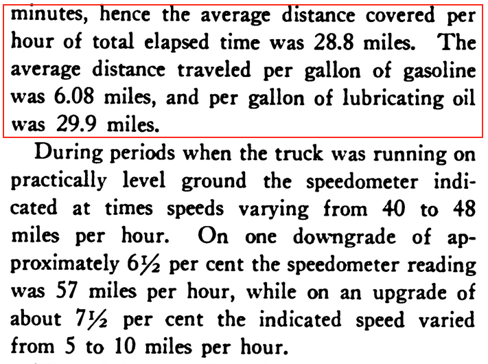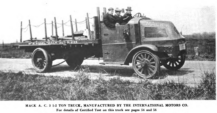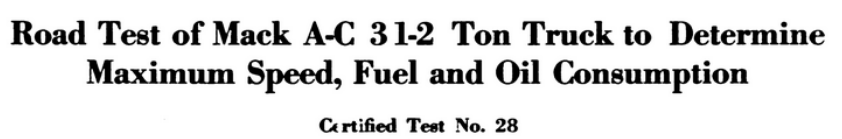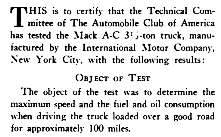 Results: average distance covered per hour - 28.8 miles; distance per gallon of gasloline - 6.08 miles, distance per gallon of lubricating oil - 29.9 miles. Guess it was a success since the Mack AC was a best seller.