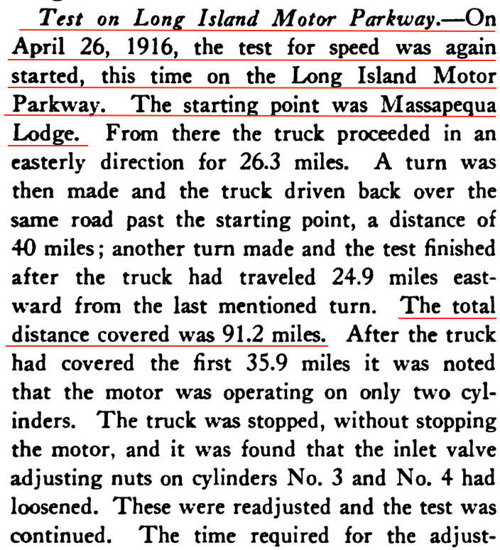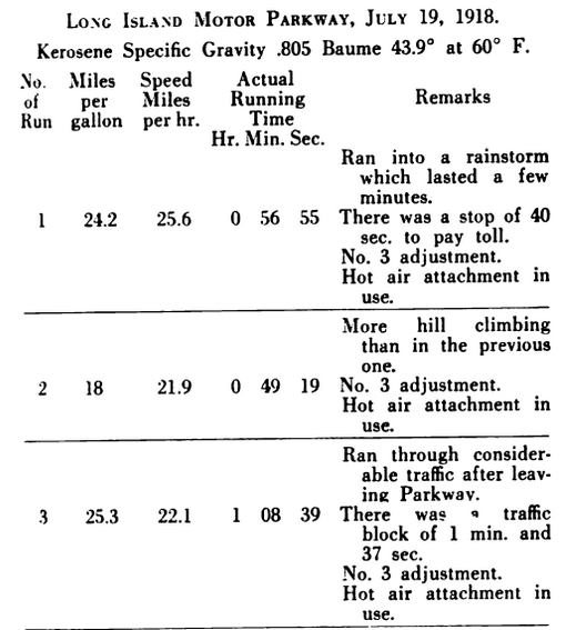 The car was filled with one gallon of gasoline and driven on the Motor Parkway until half the gas was used; it was then turned around and driven back. (The Automobile, December 18, 1913)