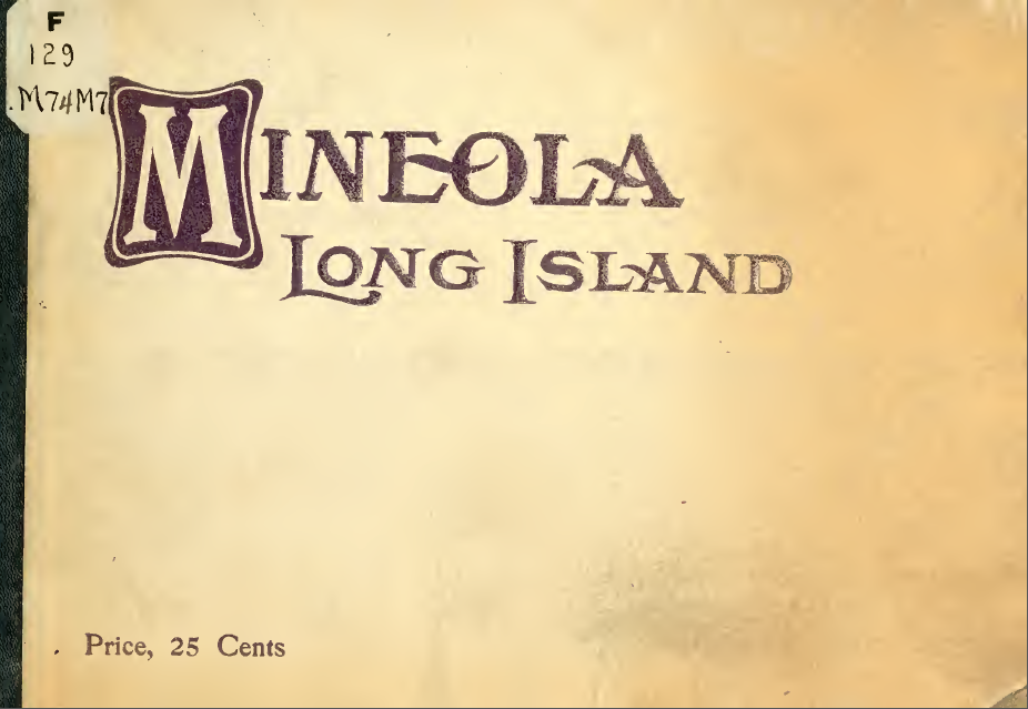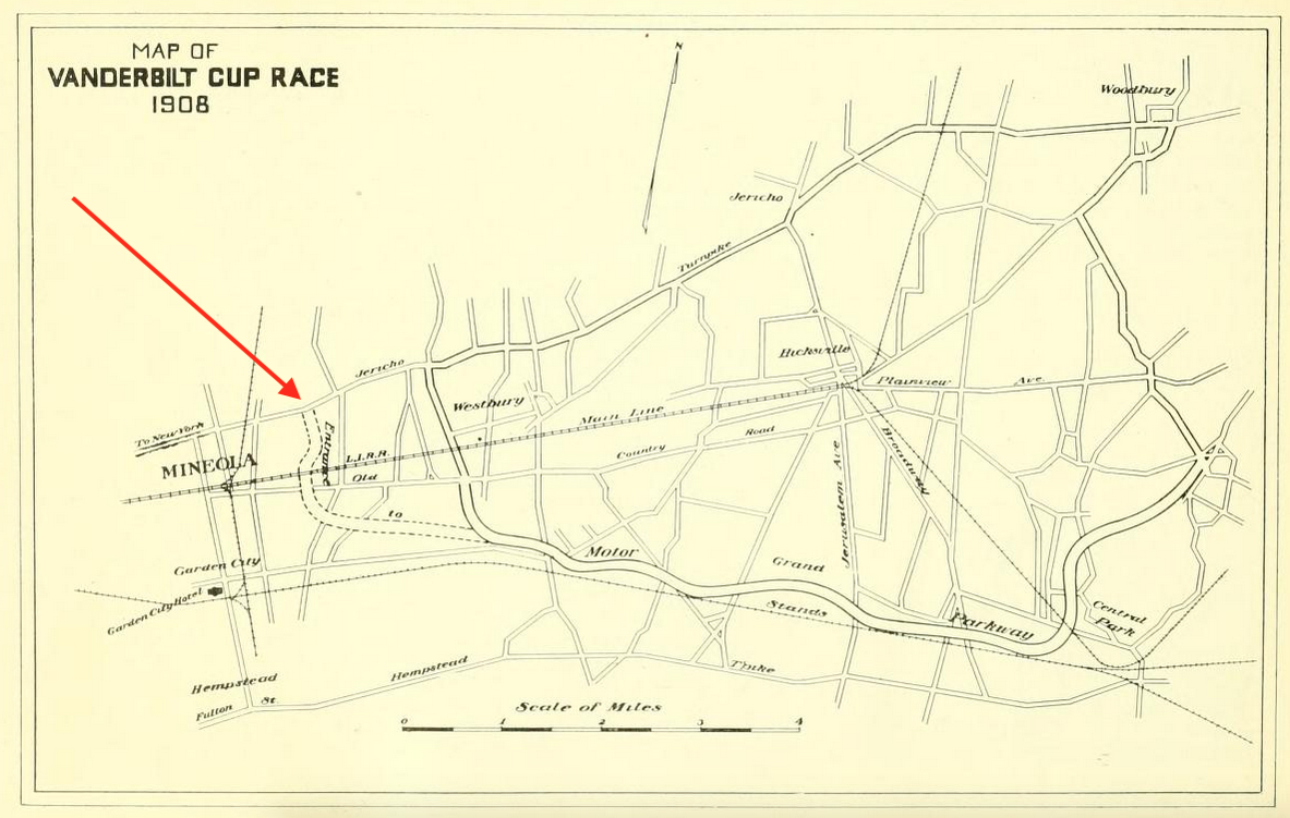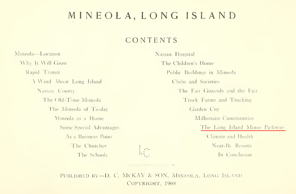 Mineola has often been mentioned in vanderbiltcupraces.com as significant to the development of the Motor Parkway and the Vanderbilt Cup Races. In this 1908 publication published by D. C. McKay & Son, both are used to promote the village of Mineola.