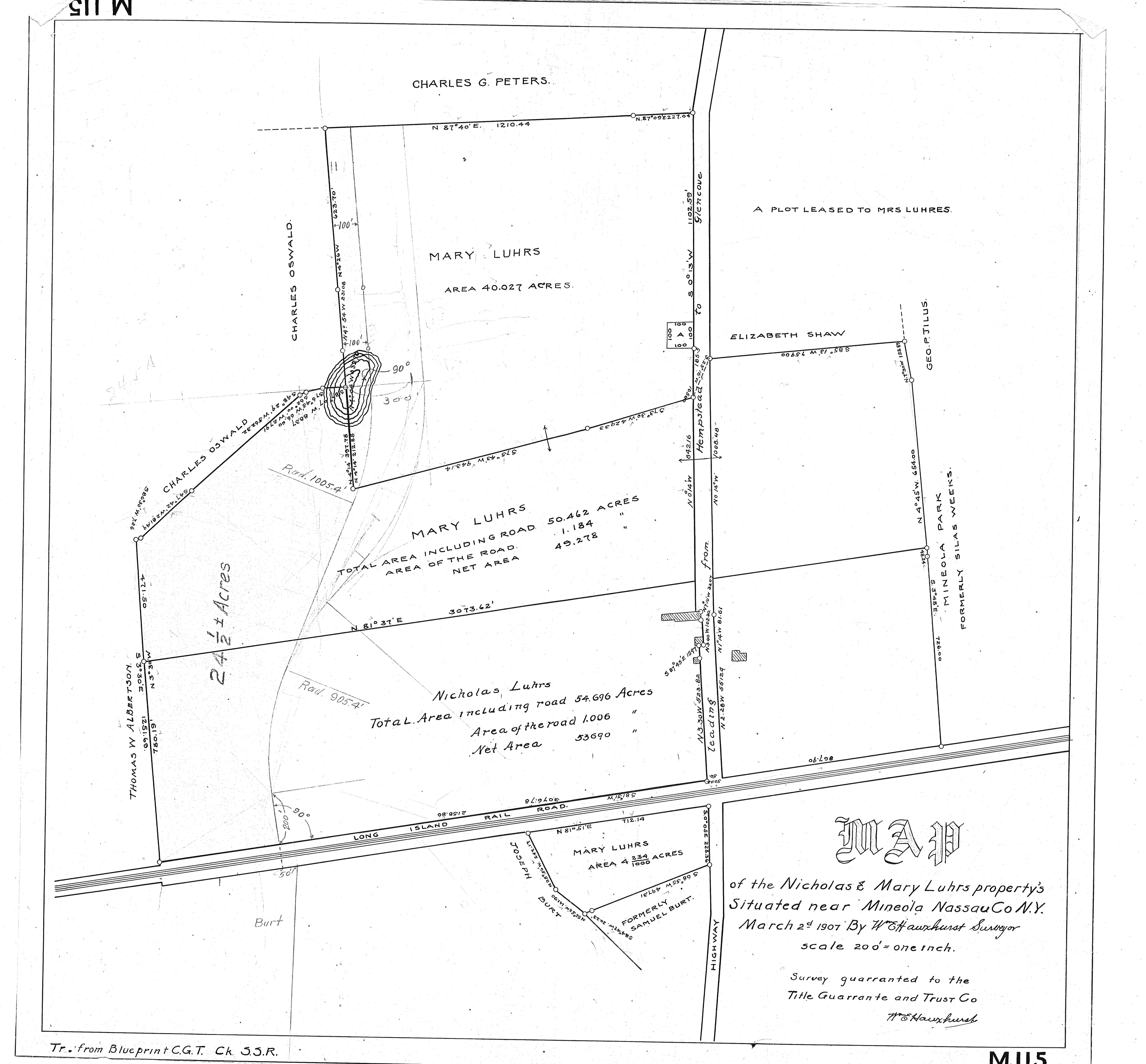 This survey from 1907 shows the Luhrs and Peters farms mentioned above which eventually were used by the Motor Parkway. More surveys of the area were shown in this Feb. 9, 2021 post.