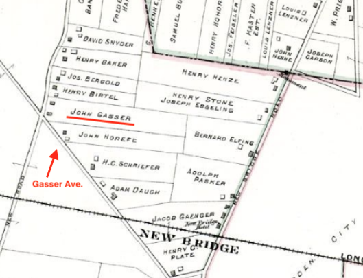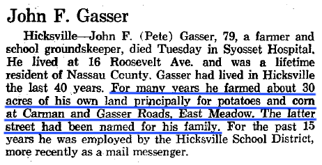 How many names can a street have? Look through the years to see what this stretch of roadway was called. An early name was Westbury Road during the Motor Parkway years, but others have been noted. Among these is Gasser Avenue that reflected the family farm of John Gasser shown here. (these and the following maps courtesy of Historicmaps.com unless otherwise noted)