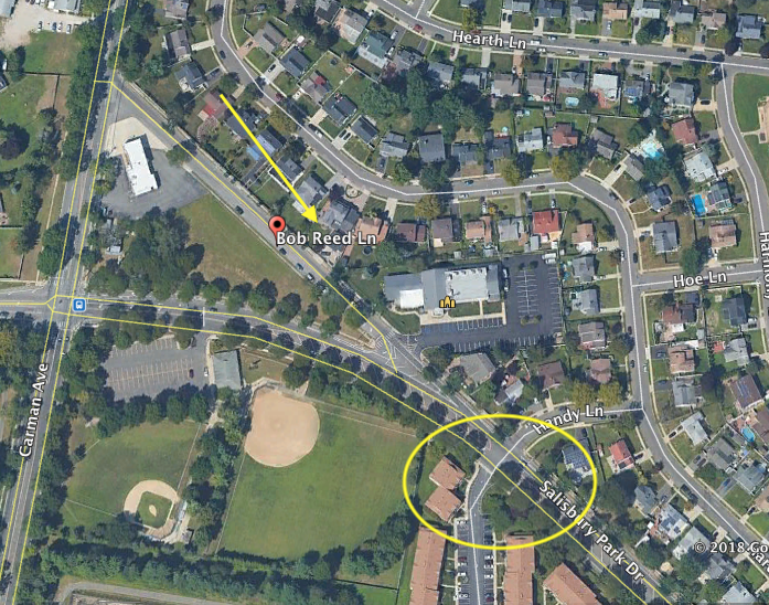 2018: Current photo showing the street is now named Bob Reed Lane, a firefighter in the East Meadow Fire Department who lost his life following a 1981 fire. A firehouse is in the triangle formed by Salisbury Park Drive, Carmen Avenue and Bob Reed Lane.