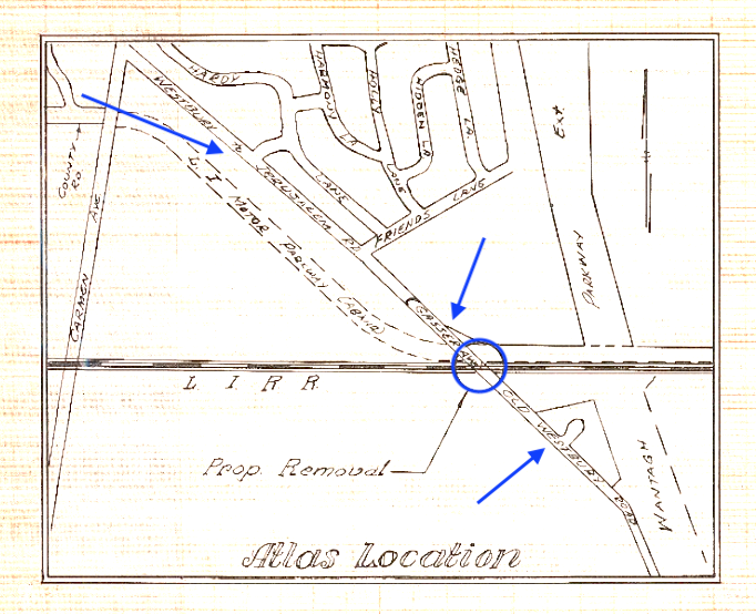 This next installment of my Motor Parkway bridge removal series takes us to the Westbury Road Bridge in East Meadow. Located between Carmen Avenue and the Wantagh State Parkway, the bridge is classified as a "parkway" bridge since the Motor Parkway went over Westbury Road (now called Old Westbury Road). While researching this bridge, the name of its associated street often varied depending on the documents reviewed. And for those of you interested in the transformation of roads into the county highway system, I've included several Legal Notices published in Newsday during the mid-50s pertaning to this section.