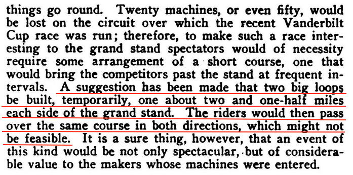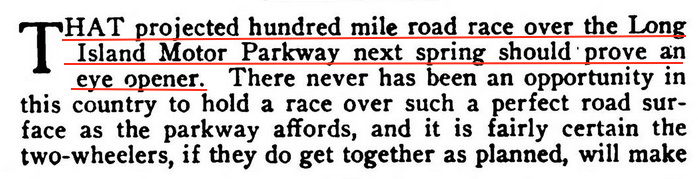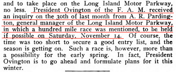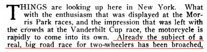 Following the 1908 Vanderbilt Cup Race, the Federation of American Motorcyclists entertained a request for a race to be held in November. (Motorcycle Illustrated, Nov. 15, 1908)