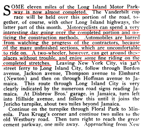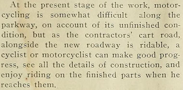 Motorcycle oriented publications reported on the progress of The Motor Parkway and how, unlike, automobilists, motorcyclists could ride on it to get a feel for it. (Motorcycle Illustrated, Oct. 1, 1908)