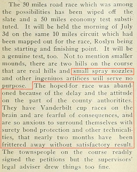 The July 3 event was switched from a race to an "economy" test, partly because of the "consequences" that county (I presume, Nassau County) officials encountered from earlier Vanderbilt Cup Races. Anyone want to guess what "spray nozzles" might relate to as mentioned here?