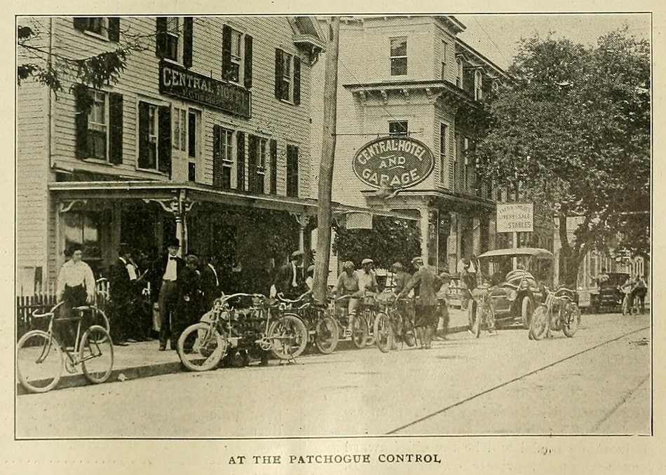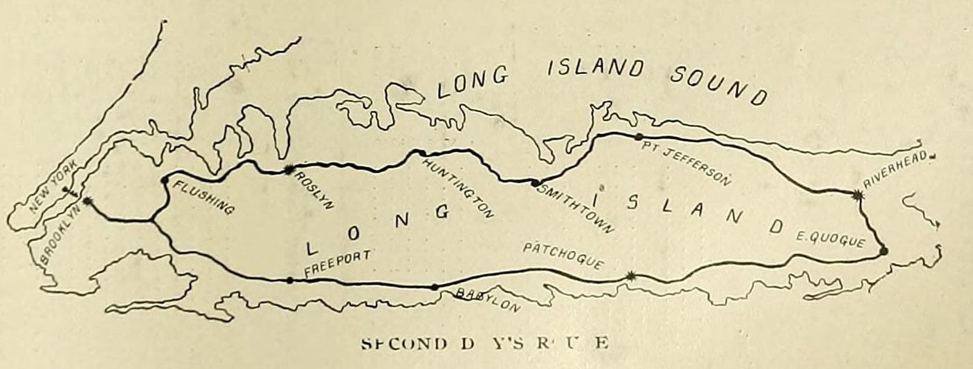 Routes of the contests often included both shores of Long Island and included "control" stops - this map shows the stops at the start of the race in Brooklyn, Roslyn, Riverhead and Patchogue.