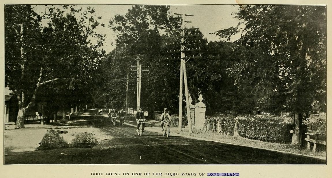 The photo captioned “Good going on one of the oiled roads of Long Island” is on Northern Blvd looking east. The columns on the right are the west entrance to the Whitney estate. Attached is a postcard looking directly at the entrance. Whitney Pond is on the right.