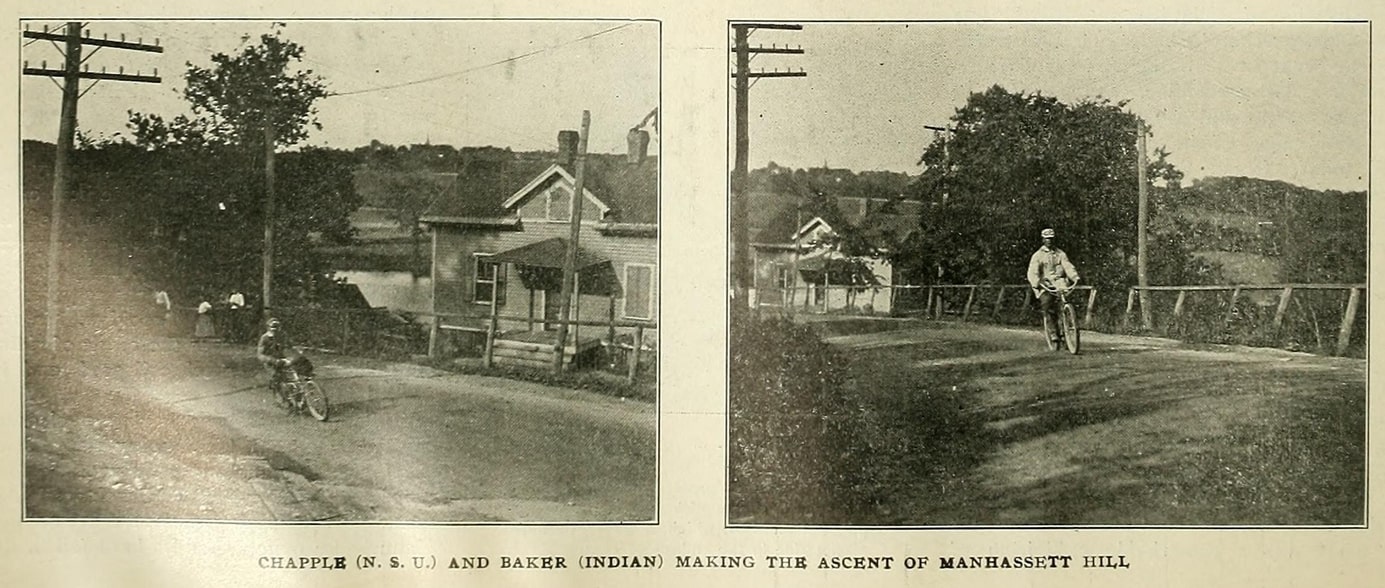Numerous motorcycle races and "economy" tests were held on Long Island in the early 1900s many of which were on other roads besides the Motor Parkway (some however, were influenced by the Vanderbilt Cup Races). These photos are from one such event held on July 3, 1908. All photos are from the May 30 and July 4, 1908 issues of Bicycle World and Motorcycle Review.