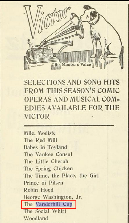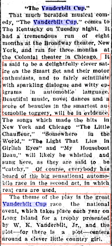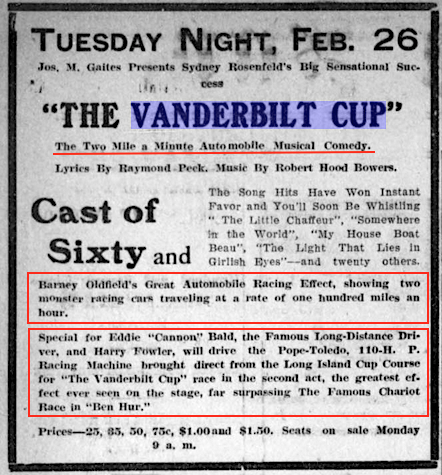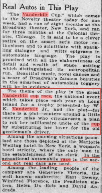 Besides Elsie Janis starring in "The Vanderbilt Cup" on Broadway, the musical comedy was performed throughout the United States with the automobile race scene and drivers often promoted as the main attractions.