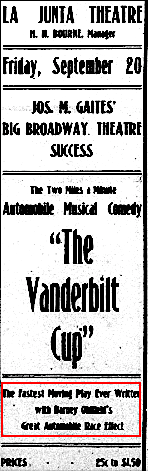 La Junta Theatre (Colorado) - "The Fastest Musical Play Ever Written with Barney Oldfield's Great Automobile Race Effect". (La Jaunta Tribune, Sept. 14, 1907)