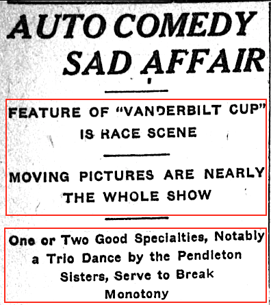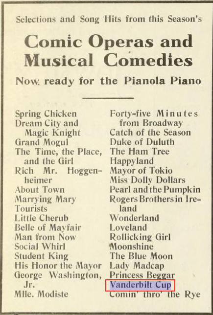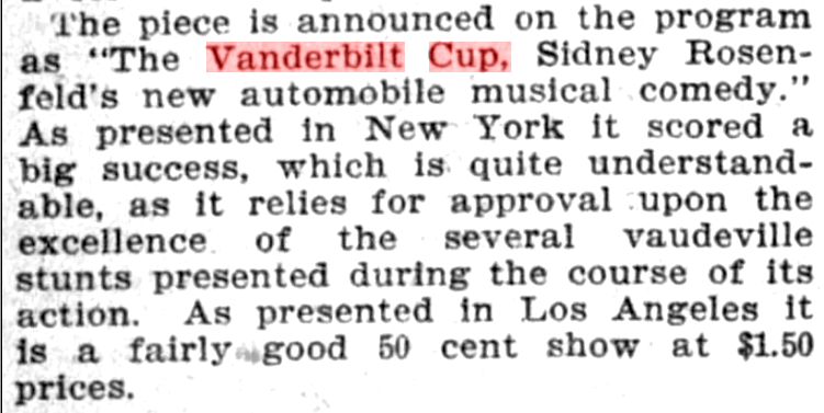 The Novelty Theatre in San Francisco began its run of "The Vanderbilt Cup" on Oct. 27, 1907 featuring "plenty of pretty girls" and "two monster racing cars". (The Argonaut, Nov. 2, 1907)