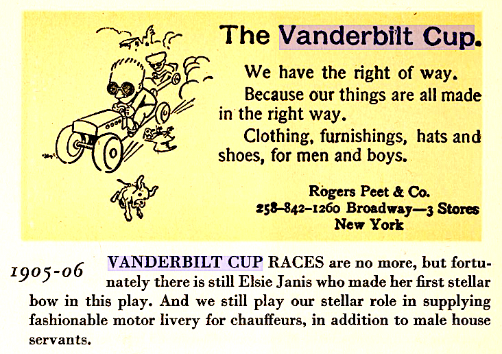 Coming back to New York 20 years later, Rogers Peet used "The Vanderbilt Cup" and Elsie Janis to advertise its "fashionable motor livery for chauffeurs, in addition to male house servants". (Rogers Peet History of the New York Stage, 1930)