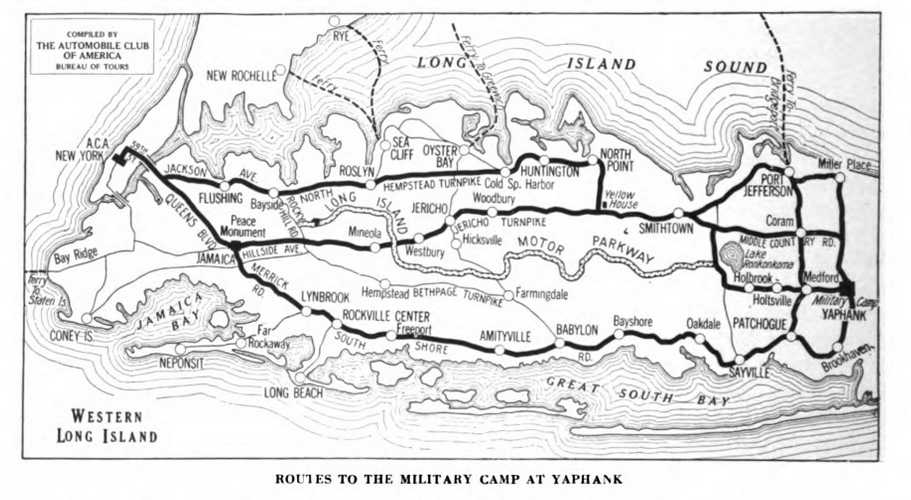 1917: Note Rocky Hill Road near the western end of the Motor Parkway, the "yellow house" west of Smithtown and the "military camp" at Yaphank far right.