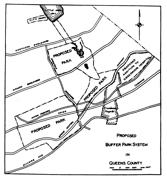 This 1925 map is not from the ACA but rather from a report issued by The NY State Council of Parks.  The "buffer parks" proposed included Cunningham and Alley Pond Parks in Queens of which the Motor Parkway abutted.  Also shown are proposed additions to Creedmoor Hospital