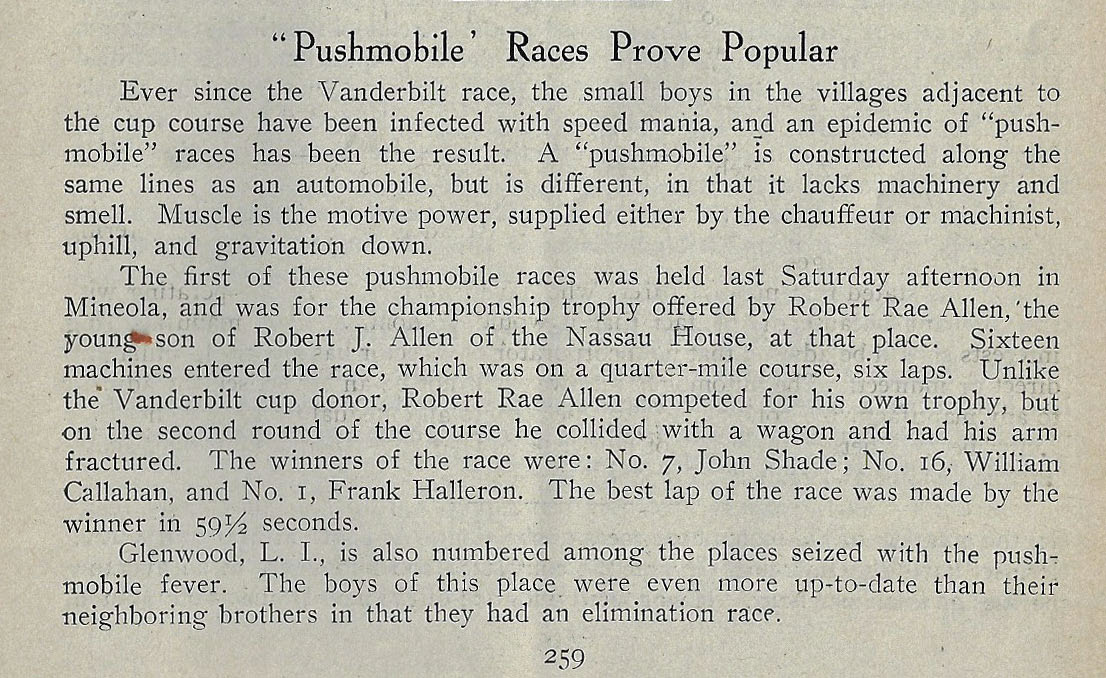 The race was run on the same Jericho Turnpike in Mineola as the Vanderbilt Cup Race and was sponsored by a four year old, Robert Ray Allen, the son of Robert J. Allen of the Nassau Hotel! The Automobile, October 25, 1906