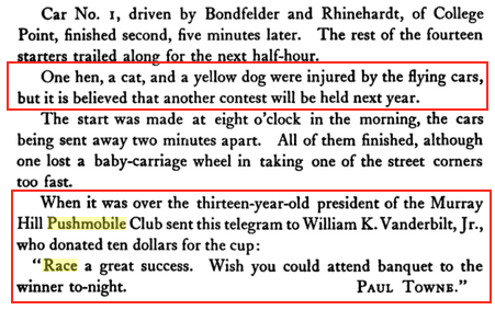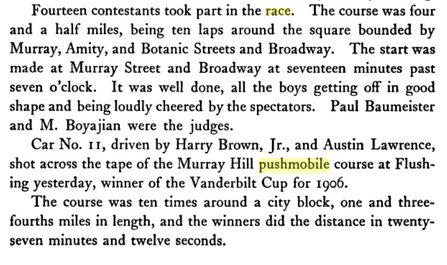 Unfortunately, Robert Ray Allen had to withdraw in the second lap. Instead of horsepower, the cars were powered by muscle and gravity. Automobile Topics, November 3, 1906 p259
