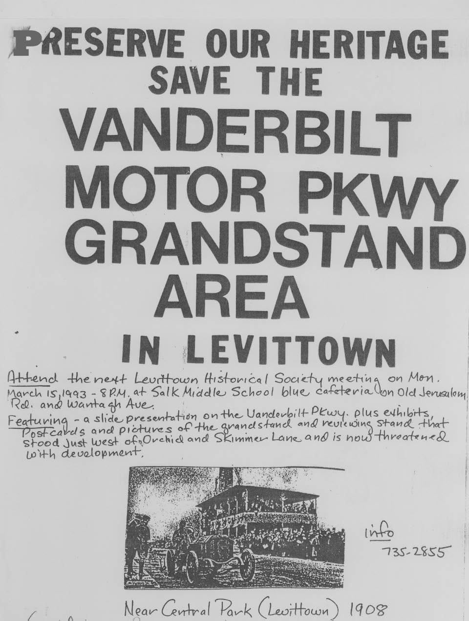 The LevittownPatch reported on the potential housing development on the location of the grandstand and press box for the 1908 to 1910 Vanderbilt Cup Races on the Long Island Motor Parkway.