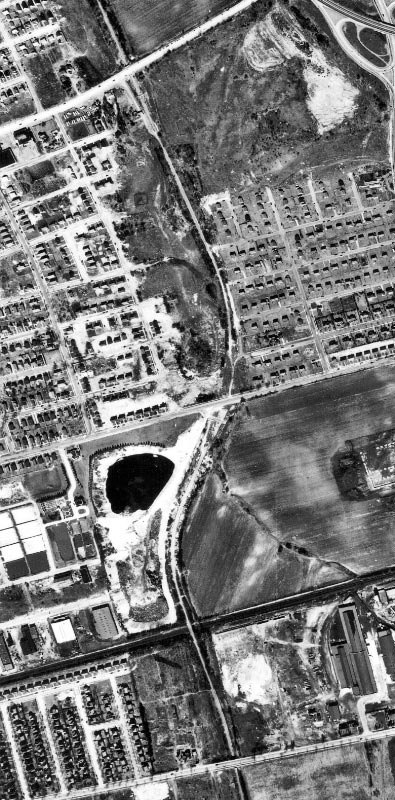 The bridge over Westbury Avenue can be seen in this blurry 1938 aerial. Note: The 300-foot embankments.