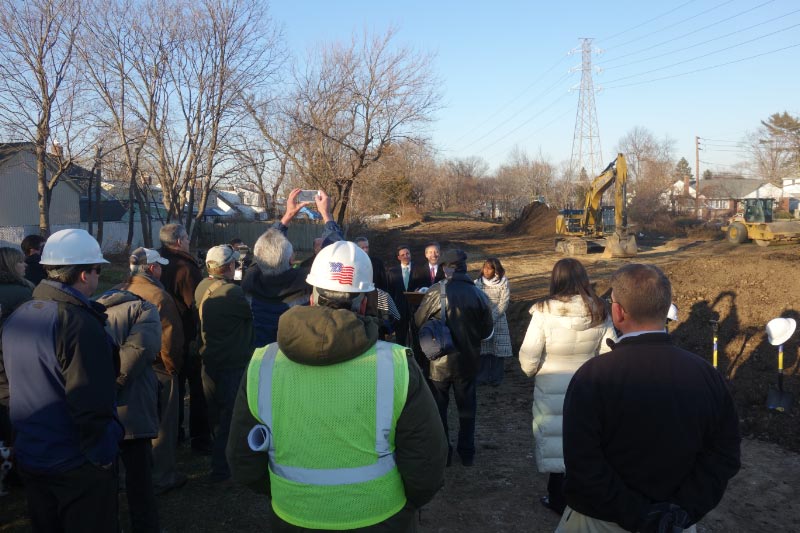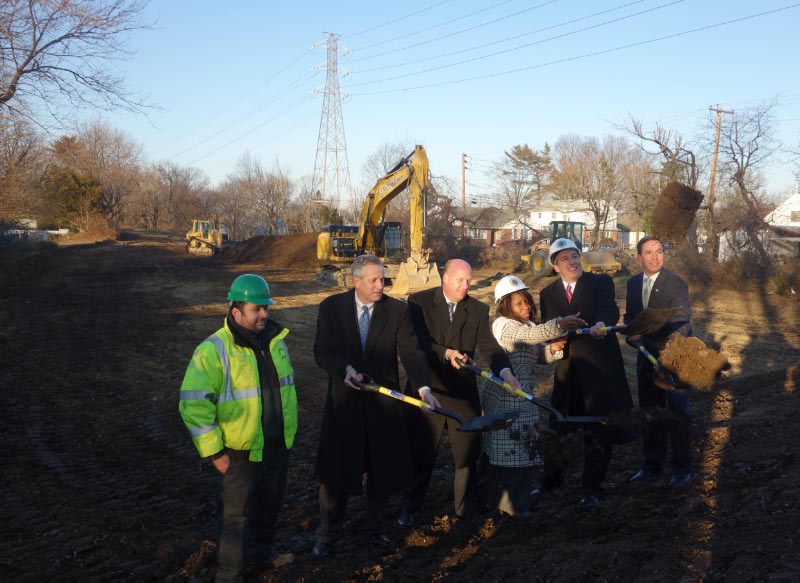 Town Supervisor Jon Kaiman, State Senator Jack Martins, Mayor Scott Strauss of Mineola, Councilwoman Viviana Russell, Legislator Michael Venditto joined contractors and residents for a ground-breaking ceremony for the flood mitigation basin near the Motor Parkway right-of-way.