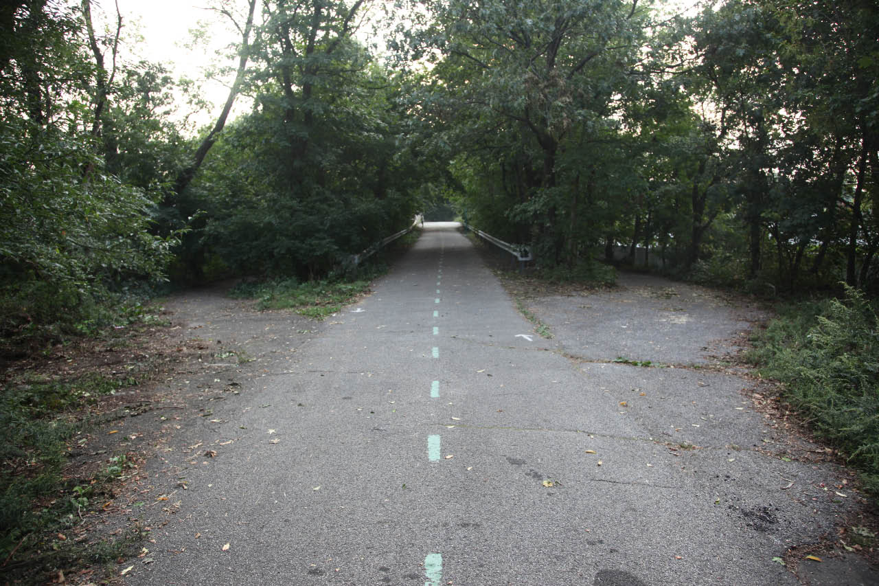 Looking west towards the bridge at the location of the Rocky Hill  Road Lodge. Note the ramps on both sides of the road.