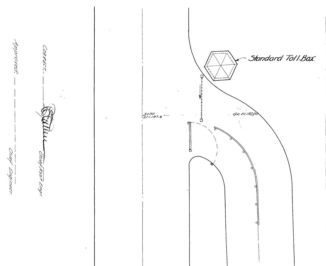The lodge was referred to as a "Standard Toll Box". Note: a two lane entrance/exit was planned.