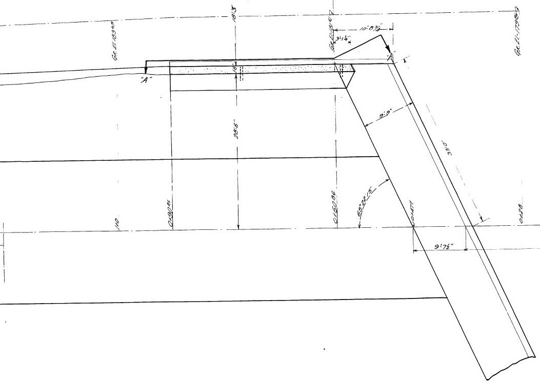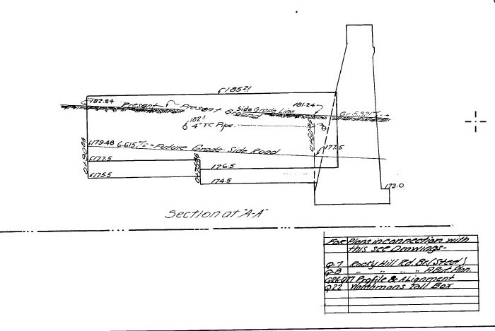 Frank, dotted line [-o-o-o-] and scissors (or expansion) gate [XXXX] refer to the 1914 plan, where I marked it as “XXXX” on this excerpt. I can’t see any such on the 1938 photo; what I do see are barrier posts and rails. The arrow shows that something moved away from the box to a post across the inbound{?} (outer) lane. I’m thinking now that that may have designated a padlocked chain across the lane. Why a chain (or whatever) on one side and the familiar “turn” pike-cum-swinging gate on the other eludes me. Sam, III