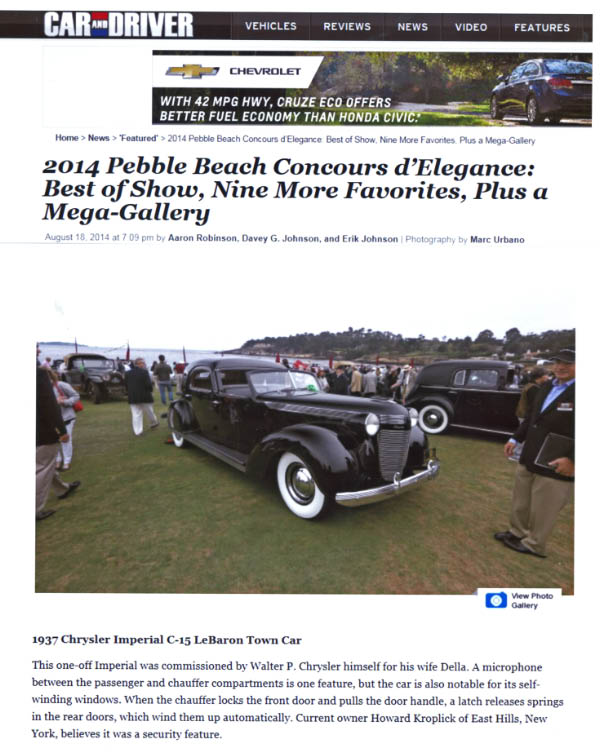The 2014 Pebble Beach Concours d'Elegance was an amazing experience for the Chrysler's Chrysler. Fortunately, the memorable moments were captured by hundreds of photographers including: Bruce Adams, Richard Kaye, Randy Rosenberg, Steve Green, Roz and Howard Kroplick, and John Cuocco.